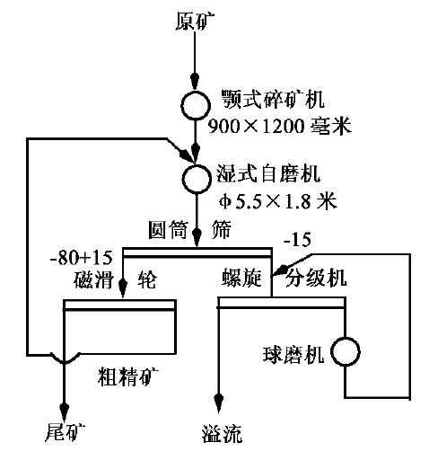 生產初期采用兩毆全閉路半自磨流程醫圖1(a)。原礦粗碎至350~0毫米,給入濕式自磨機磨碎,自磨機與高堰式螺旋分級機由泥勺機提升組成閉路。自磨機排礦經圓筒篩過篩后,+10毫米物料返回自磨機,篩下物料進螺旋分級機分級,返砂也返回自磨機,分級溢流細度為50%~200目左右。分級溢流經一段磁力脫水槽脫泥、脫水,并廢棄部分尾礦后,進入第二段磨礦。第二段磨礦為溢流型球磨機與螺旋分級機組成的預檢分級磨礦回路,分級溢流細度為80%~200目,合格溢流進磁選選別。兩段閉路自磨流程的主要問題是,兩段磨礦的負荷不平衡,往往第一段負荷高,第二段負荷不足,而且難以調節;同時,自磨機中易形成難磨粒級的聚集,致使自磨機的產量提不高,若加大給礦量,則自磨機造成“脹肚”。針對上述存在問題,將原流程改為兩段一開路,如圖1(b)。第一段自磨機開路工作,圓筒篩篩孔改為5毫米,取消了螺旋分級機,篩上產物不再返回自磨機,而給入第二段球磨機磨碎,篩下產物直接進磁力脫水槽和第二磨礦段。自磨機開路工作后提高了處理能力,第二段磨礦的負荷也得到提高,兩段磨礦的負荷趨于平衡。例:某鐵礦兩段半閉路半自磨流程。如圖2所示。