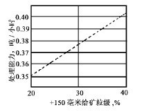 為使自磨機效率高工作,給礦中各粒級保持適當配比是重要的。某燒結總廠對給料中大小粒級配比的試驗結果列于表1。從表中可以看出,給料+300毫米粒級與-300毫米粒級各占50%時,其產(chǎn)量更高,磨碎效果更好。其產(chǎn)量與全部是粗粒級或全部是細粒級比較,分別提高30.6%和50.5%。又如北美的皮坎茲_瑪瑟公司(PickandsMather&Co)試驗了原礦中含不同比例)+150毫米粒級的物料對自磨的影響,如圖3-3-10所示。從圖中可看出,給礦中+150毫米粒級的物料產(chǎn)率減少,自磨機的處理能力也隨之降低。為此,認為首段自磨機的給礦粒度組成應保持在+150毫米占40%,-150+75毫米占20%和-75毫米占40%。因而,必須采取配礦措施以保持給入自磨機的原礦粒度特性合適。
