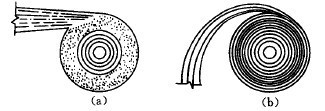 給礦口的大小對(duì)處理能力、分離粒度以及分級(jí)效率均有一定影響。其直徑常與旋流器直徑呈一定比例,大多dc=(0.08~0.25)D。給礦口的橫斷面形狀以矩形為好。而縱斷面常為圖3-4-19(a)所示的切線形。由于這種進(jìn)料方式易使礦漿在進(jìn)入旋流器時(shí)與器壁沖擊產(chǎn)生局部旋渦影響分級(jí)效率。因此出現(xiàn)了如圖3-4-19(b)的漸開(kāi)線形及其他型式的給礦管。