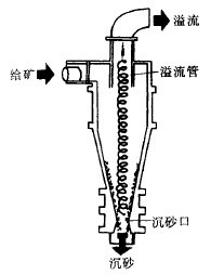 | 旋流器的構(gòu)造如圖3-4-17所示。主要由一個(gè)空心圓柱體和圓錐體連接而成。圓柱體的直徑代表旋流器的規(guī)格,由50~1000mm,常用者為125~500mm。在圓柱體中心插入一個(gè)溢流管,沿切線方向接有給礦管,在錐體下部留有沉砂(或稱底流)口。 |