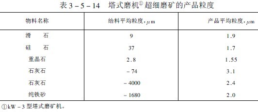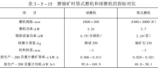 表3-5-14示出了利用塔式磨機磨碎不同物料獲得的產品細度,表3-5-15列出了利用球磨機和塔式磨機磨鈾礦石時的結果對比,從該試驗結果可以看出按產生一噸小于200目物料所消耗的電能計,塔式磨機比球磨機低一倍以上。