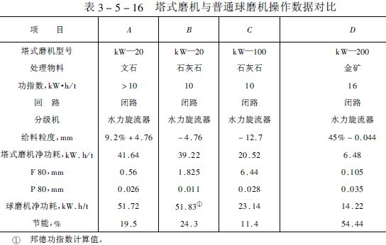 表3-5-16示出了美國科珀(Kopper)公司的某一子公司提供的塔式磨機與球磨機的工作性能對比結果,表中,例A、B是實驗室試驗結果;C是南方麥奇根煙氣脫硫系統磨機工作結果;D是裝在可蘭德湖拉卡礦業公司再磨回路中應用情況,根據該公司的試驗結果得出下述見解: