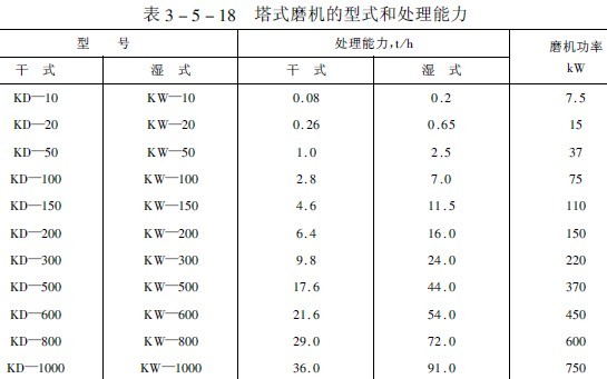 表3-5-18列出了日本生產的塔式磨機的系列產品,并列出了該系列產品處理給料粒度小于3毫米,產品粒度平均10微米的處理量(噸/時)。